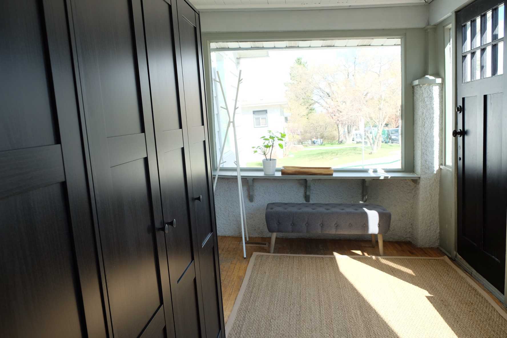 This Design Dilemma came from a young couple with a baby. They had recently moved into an older home that had all the old home charm along with the challenging quirks – the space they needed help with was the sunroom at the front of the house. This used to be a porch, which was later enclosed, but it is just too hot/cold for much of the year to be a usable living space, so they were using it to store their coats and shoes.