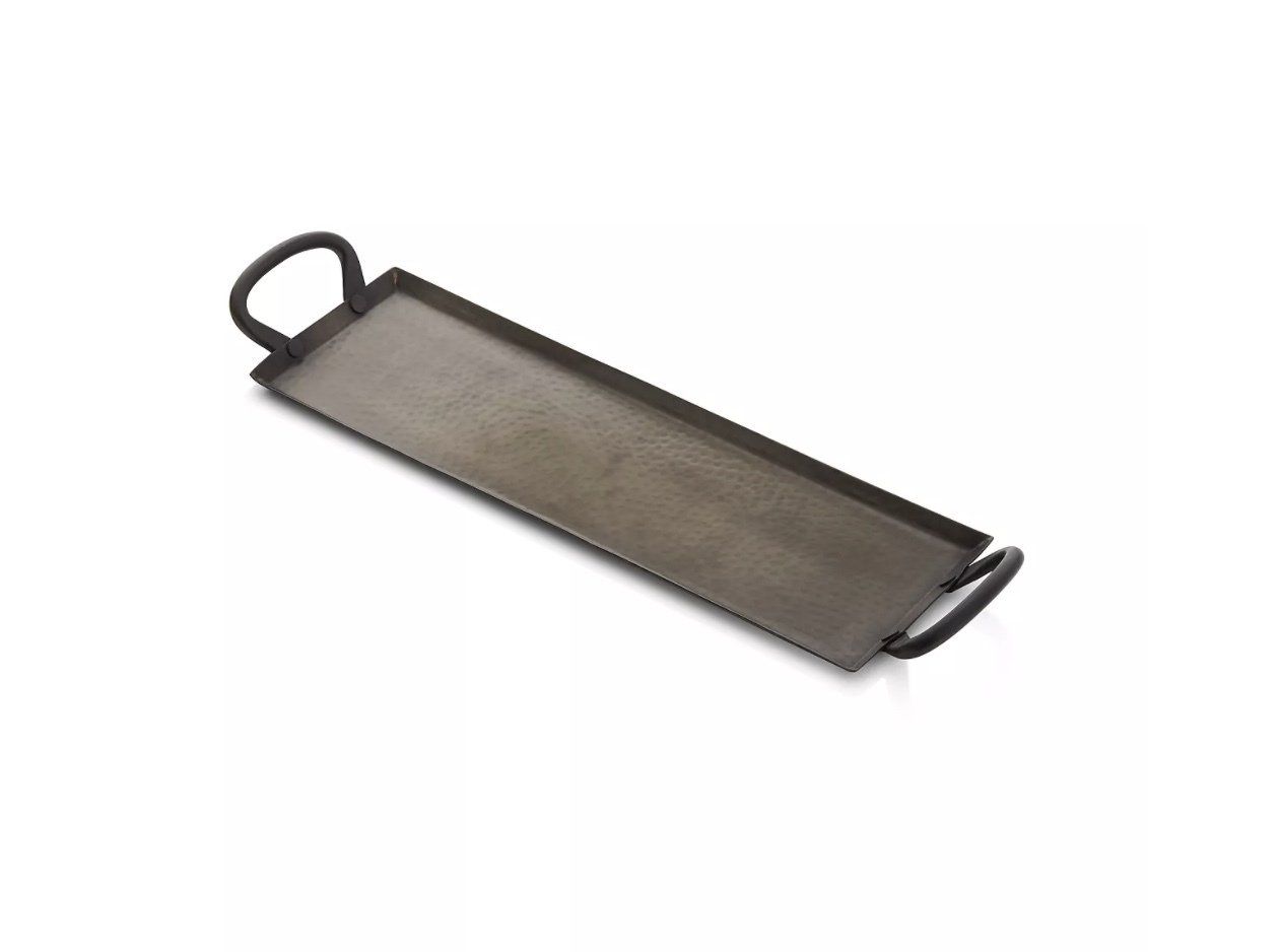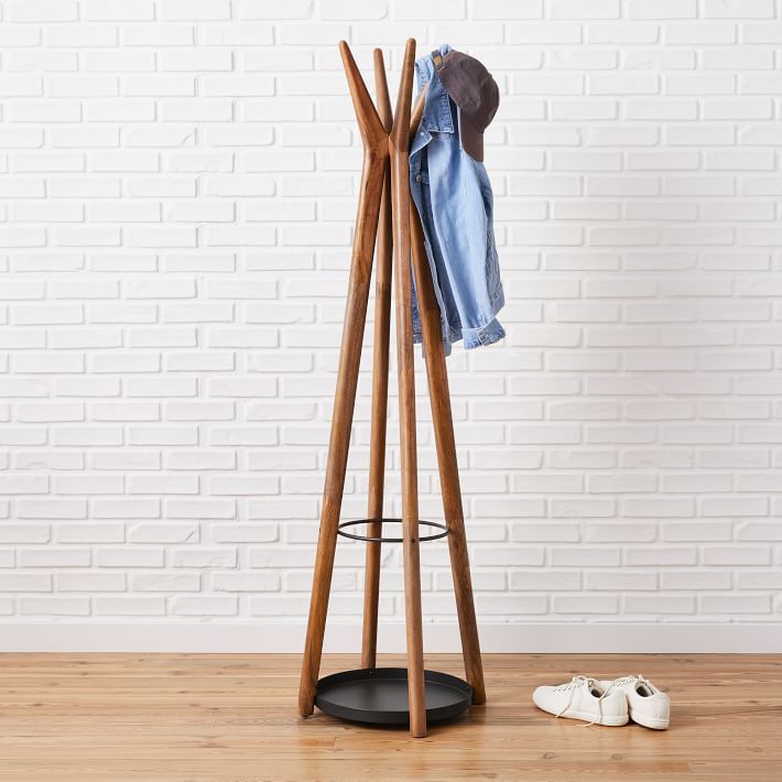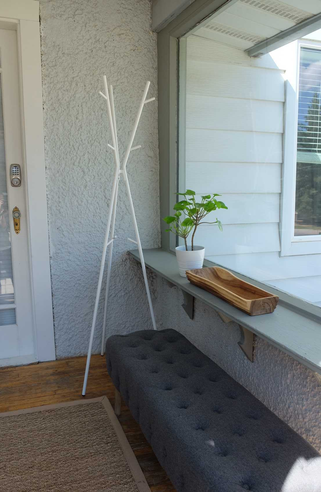 On the other wall, I added a bench and a tray; this provided a spot for people to sit down to take off their shoes and leave their purse, keys, or sunglasses. I also added a hanging mirror and another faux plant, as well as a coat rack to give another spot for visitors to plunk their coat right before they enter the rest of the house.