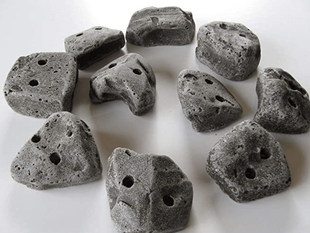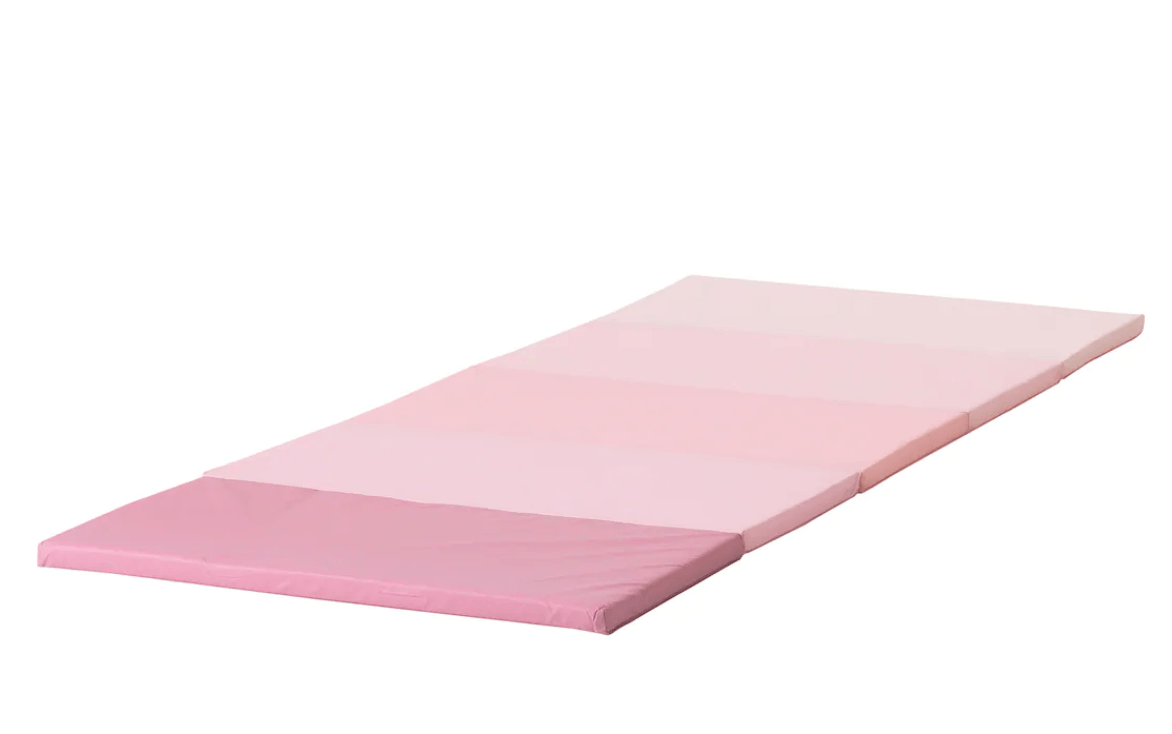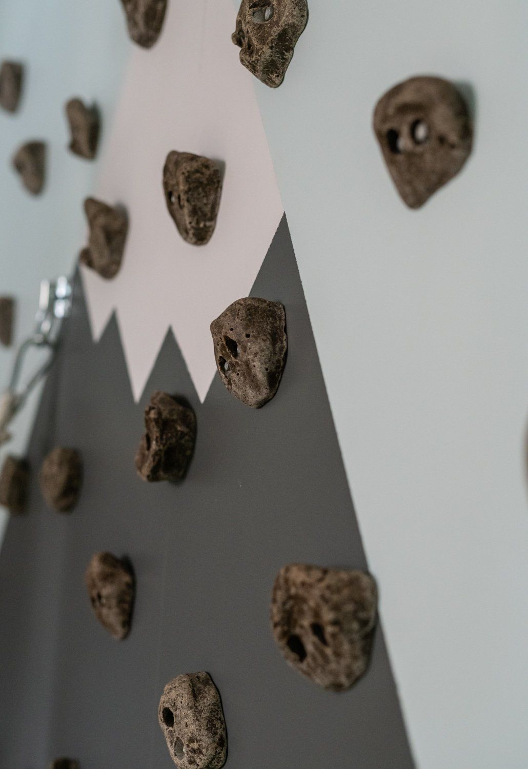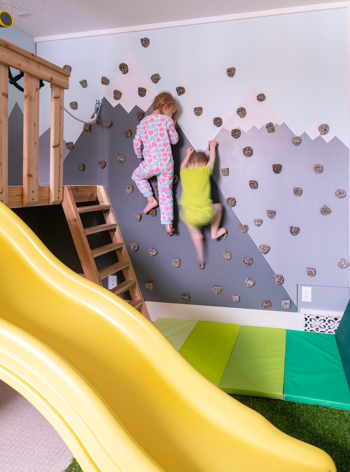 Opposite the playhouse is a climbing wall, which the kids mastered quickly and can now easily climb to the top. I painted the mountains using painters tape to create the crisp lines. To make the climbing holds extra sturdy we covered the whole wall with plywood and attached it to the studs. This way we could screw the rock holds directly into wood making it very safe and strong. It's strong enough for even us adults to climb. For extra safety we lined the floor with colorful crash mats.