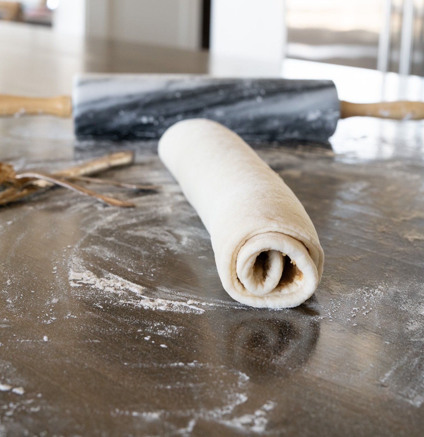 Roll dough out on a lightly floured surface to approx 10" square. Spread with your brown sugar mixture until fully covered. Gently roll up the dough like a jelly roll. Lightly pinch the edge to seal. Cut your roll into 12 slices. We find using some light kitchen twine or even unflavored dental floss works great. See image above. This will allow your rolls to maintain their shape and not get squished down with a standard knife.