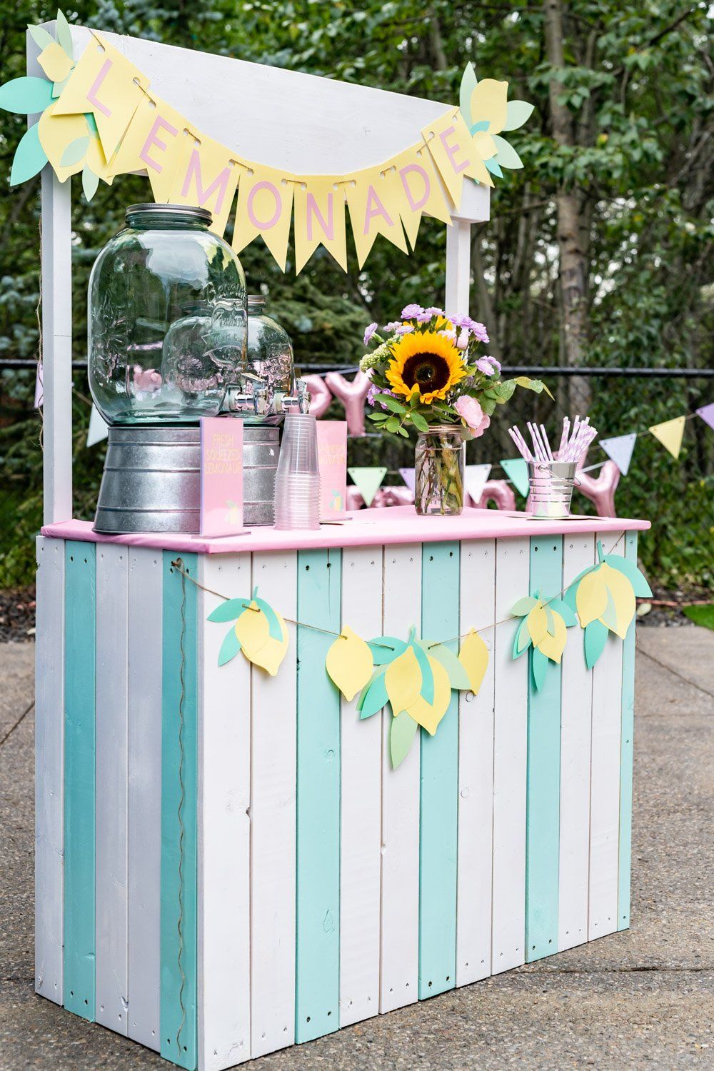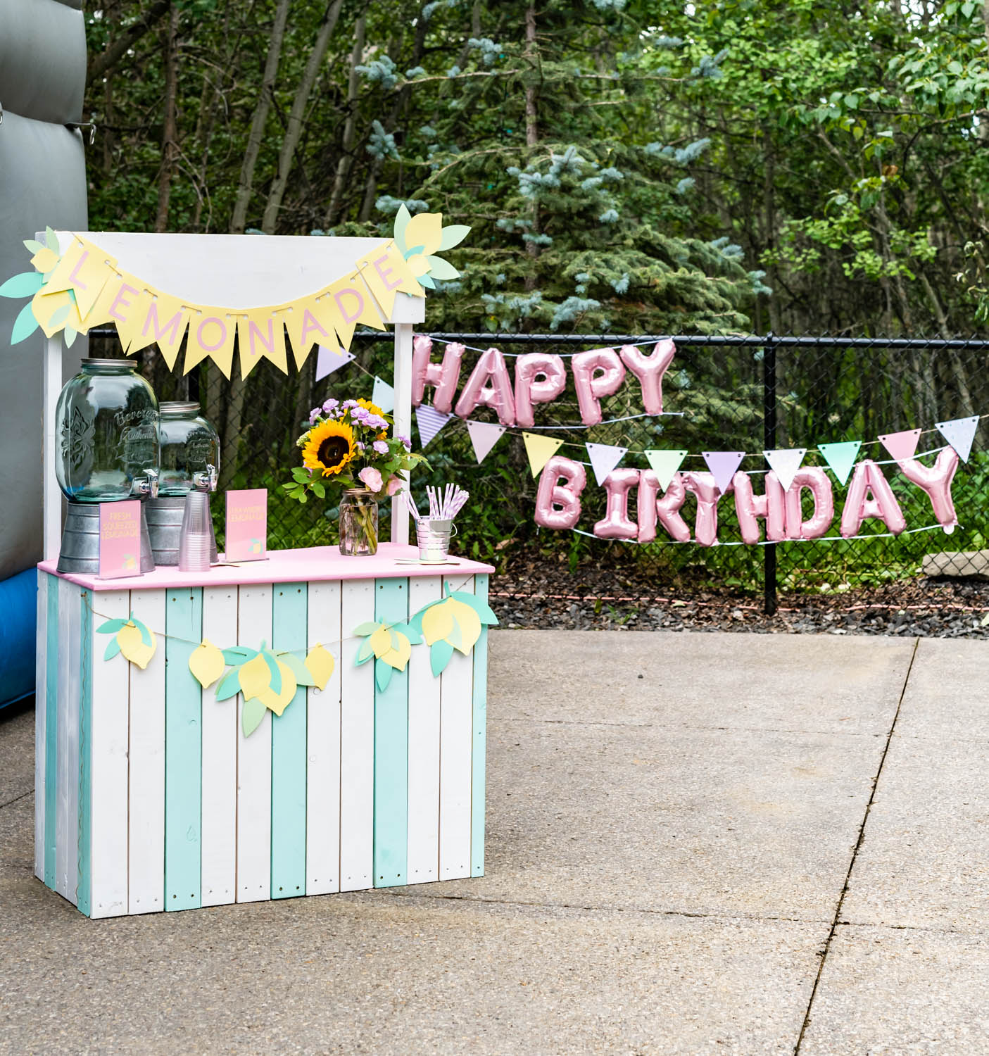 The top sign is made of 2x2s and a 2x10 board across the top as a place to add the lemonade sign. A quick sand and I spray painted the whole thing using white spray paint. The countertop is a piece of plywood that I wrapped with a pink plastic table cloth from the dollar store, which made it easy to clean up all the spilled lemonade at the end of the party. We created the cute banner and bunting using a Cricut Machine and colorful cardstock paper from the craft store. This was all scrap wood in the garage so the only cost was the paint and the kids loved filling up their cups after a good bounce in the bouncy castle.