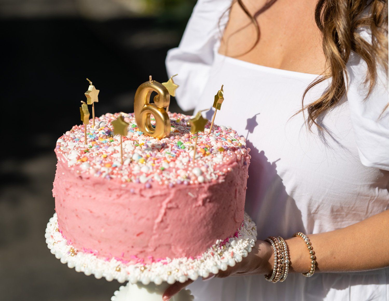 Winn requested a piñata cake this year and at first I had no idea what she even meant! She carefully explained to me that its just a cake full of candy....ok then. I used a cake box mix for the confetti cake from my local store and used three of the four cakes I baked. Using a biscuit cutter I cut the center out of the bottom two layers and added the strawberry buttercream icing for the layers. Once you have the two bottom layers iced and stacked you just fill in the center with the candy of your choice – we used mini jellybeans – add the top layer and ice the rest of the cake. I kept it really simple with a top full of sprinkles and some cute gold candles.