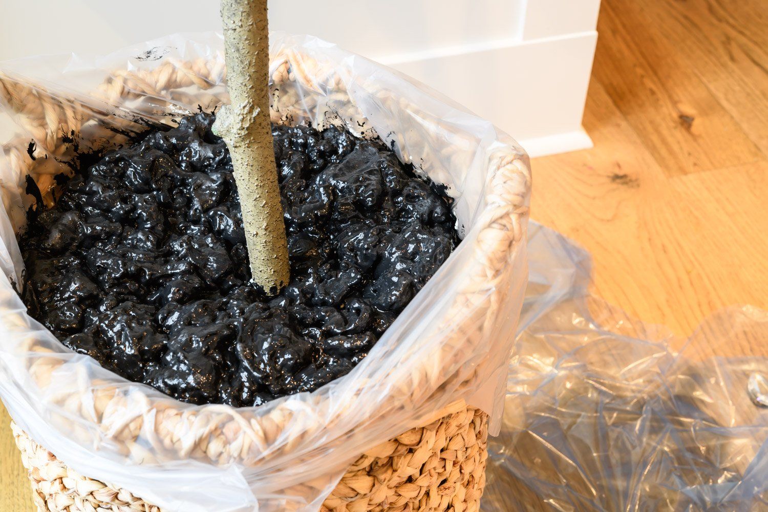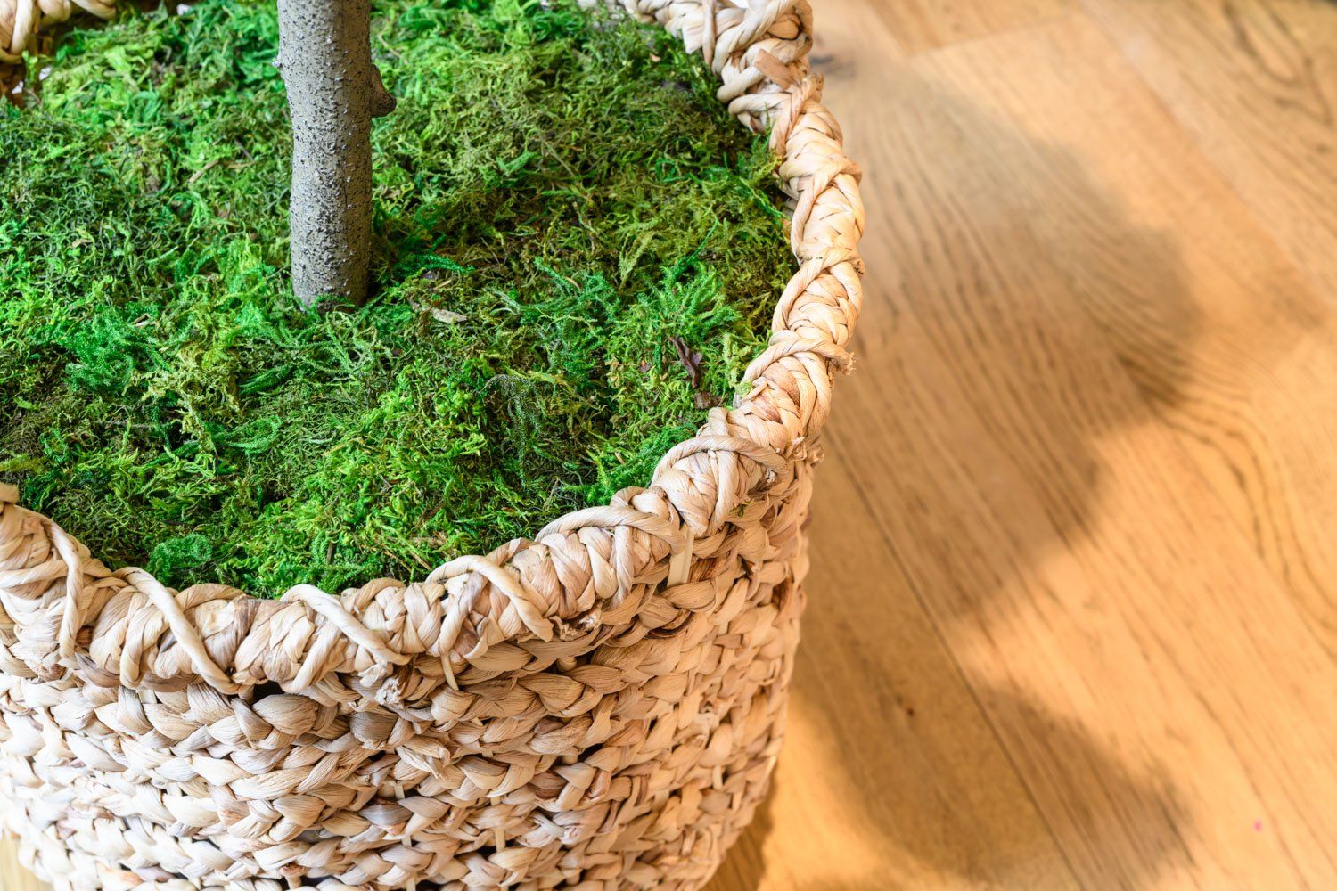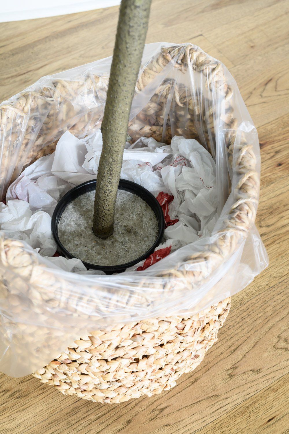 The price of your tree will be based on its height, so we want to maximize the bang for the buck by setting up the base thoughtfully. If you are using a basket, I recommend lining it with a clear plastic bag, so the foam doesn’t expand through the sides. Once you’ve lined your basket you can build up some extra height by adding in some empty shoe boxes or old books. Be careful to leave enough room for the foam and moss to cover the top of the tree base without expanding over the top of your basket.